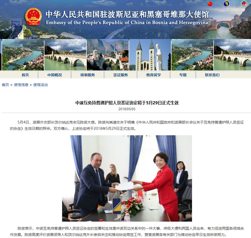 中國(guó)和波黑互免持普通護(hù)照人員簽證