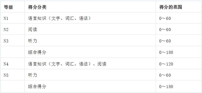 新JLPT分為N1、N2、N3、N4、N5共5個(gè)級別, N1、N2考試分“語言知識(shí)(文字、詞匯、語法)、閱讀”和“聽力”2個(gè)科目,N3、N4、N5考試分“語言知識(shí)(文字、詞匯)”;“語言知識(shí)(語法)、閱讀”及“聽力”3個(gè)科目,滿分均為180分。